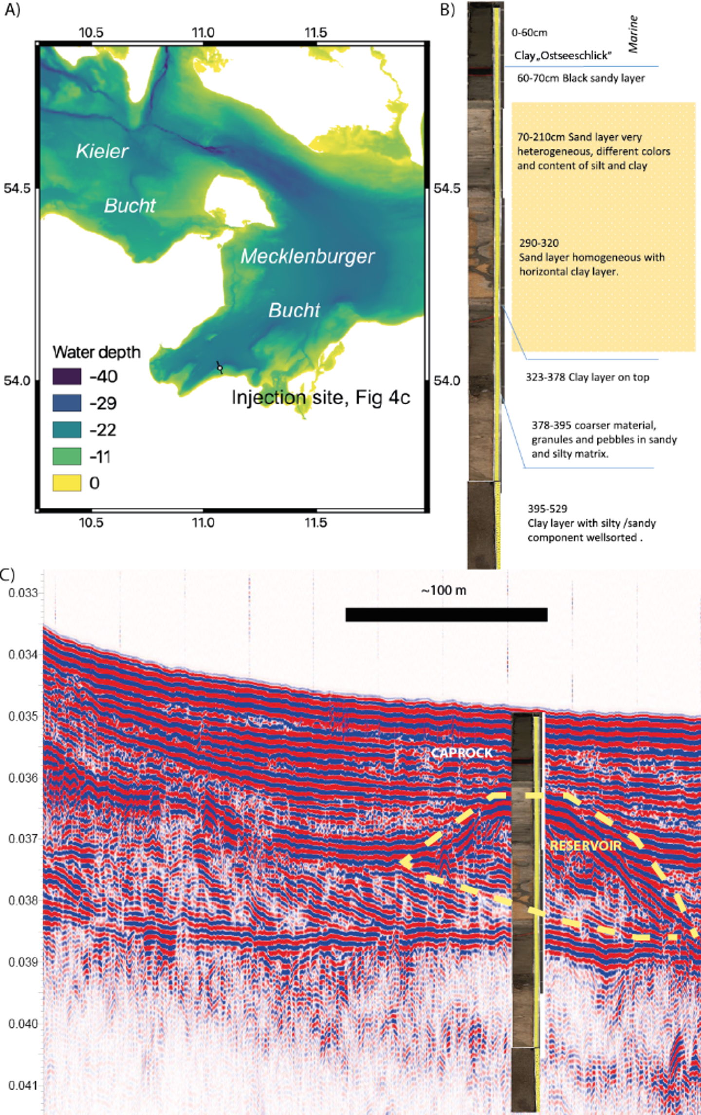 Shallow water depth of about 18 m. The depth for gas injection has to be determined later on based on the design and modelling for the site, but will likely be few meters below seafloor. For this site there is already comprehensive geological information and it would be suitable for the experiment as there are clay surface sediments with low permeability that could be uplifted.
