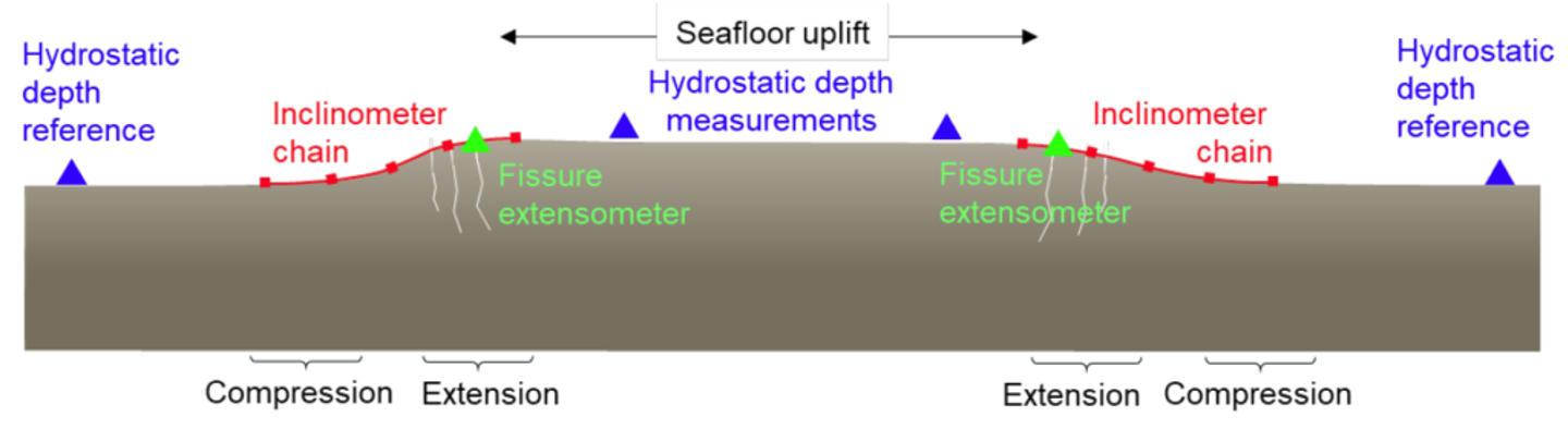 Schematic illustration of seabed uplift and possible monitoring methods (not to scale).